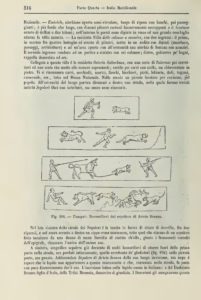 A sinistra, magnifico sepolcro già decoralo di molli bassorilievi di stucco fuori della prima porta sulla strada, ora perduti intieramente, quello eccettualo de' gladiatori (fig 194) sulla piccola porta, ma guasto. Addimandasi Sepolcro di Arido Scaltro dalla sua lunga iscrizione, ma uopo 6 sapere che la lapide non apparteneva a questo monumento e clic, rinvenuta nella strada, fu posta con poco discernimento dov'i'1 ora. L'iscrizione latina sulla lapide suona in italiano: « Ad Umliriaco Scapo figlio d'Aulo, della Tribù Meuenia, duumviro di giustizia. I Decurioni gii assegnarono questo