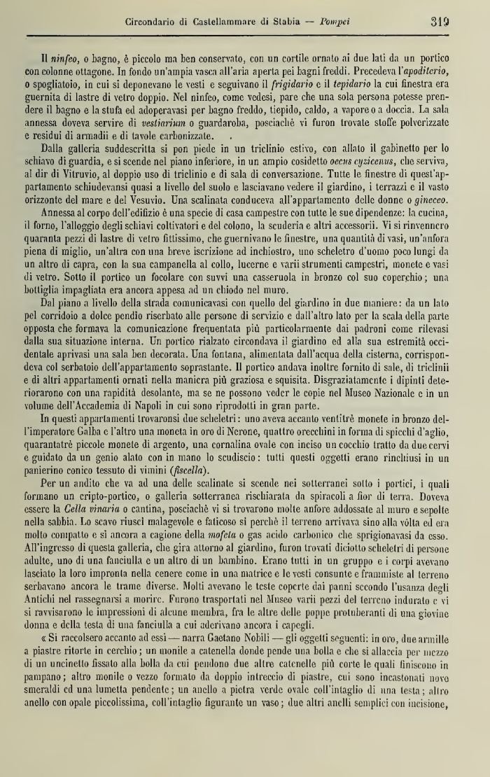 Per un andito elle va ad una delle scalinate si scende nei sotterranei sotto i portici, i quali formano un cripto-portico, o galleria sotterranea rischiarata da spiratoli a fior di terra. Doveva essere la Cella vinaria o cantina, posciachè vi si trovarono molte anfore addossate al muro e sepolte nella sabbia. Lo scavo riuscì malagevole e faticoso sì perchè il terreno arrivava sino alla vòlta ed era molto compatto e sì ancora a cagione della mofela o gas acido carbonico che sprigionavasi da osso. All'ingresso di questa galleria, che gira attorno al giardino, furon trovati diciotto scheletri di persone adulte, uno di una fanciulla e un altro di un bambino. Erano tutti in un gruppo e i corpi avevano lasciato la loro impronta nella cenere come in una matrice e le vesti consunte e frammiste al terreno serbavano ancora le trame diverse. Molti avevano le teste coperte dai panni secondo l'usanza degli Antichi nel rassegnarsi a morire. Furono trasportati nel Museo varii pezzi del terreno indurato c vi si ravvisarono le impressioni di alcune membra, fra le altre delle poppe protuberanti di una giovine donna e della testa di una fanciulla a cui aderivano ancora i capegli.
