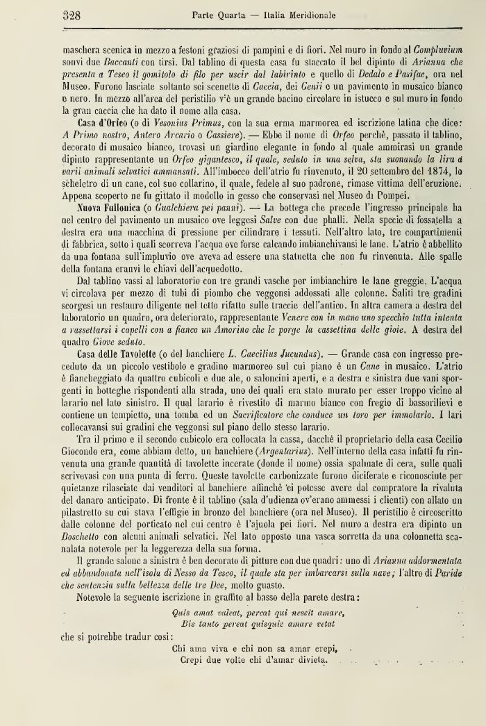 Casa d'Orieo (o di Yesonius Primus, con la sua erma marmorea ed iscrizione latina che dice: A Primo nostro, Antero Arcano o Cassiere). — Ebbe il nome di Orfeo perché, passato il tablino, decorato di musaico bianco, trovasi un giardino elegante in fondo al quale ammirasi 1111 grande dipinto rappresentante un Orfeo gigantesco, il quale, sedute in una selva, sta suonando la lira a varii animali selvatici ammansati. All'imbocco dell'atrio fu rinvenuto, il 20 settembre del 1874, Io scheletro di 1111 cane, cui suo collarino, il quale, fedele al suo padrone, rimase vittima dell'eruzione. Appena scoperto ne fu gittate il modello in gesso clic conservasi nefMuseo di Pompei.