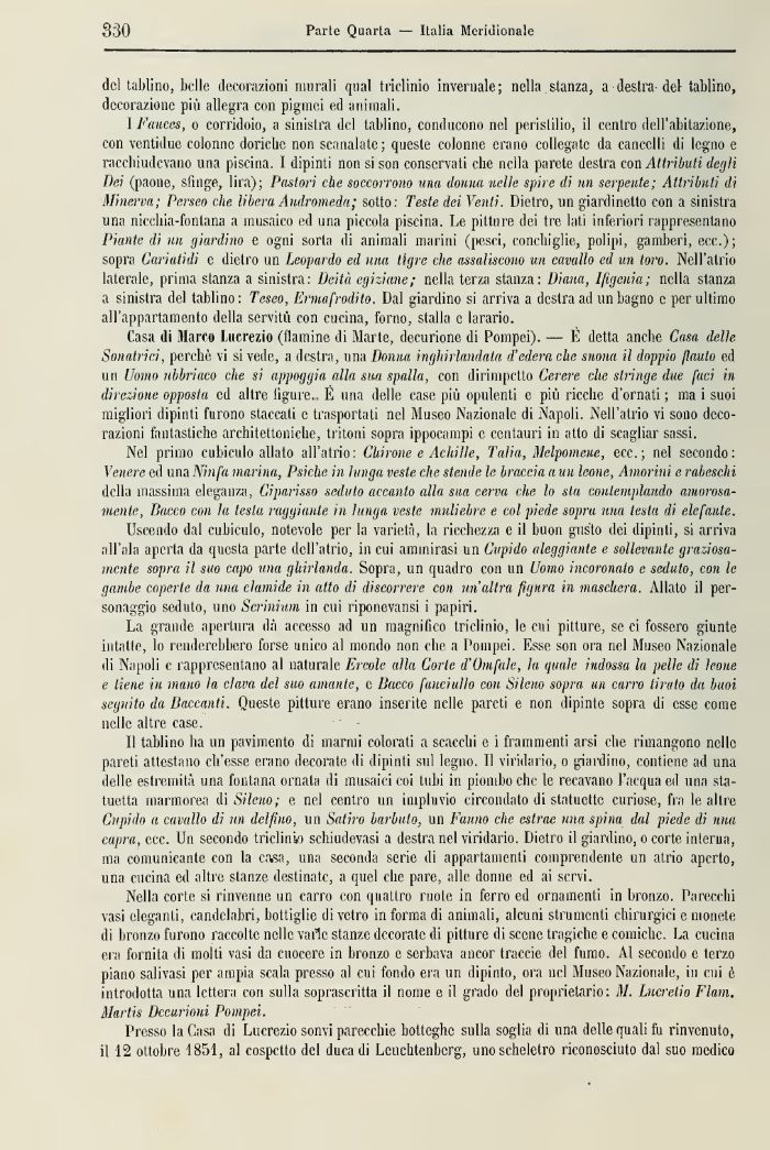 Presso la Casa di Lucrezio sonvi parecchie botteghe sulla soglia di una delle quali fu rinvenuto, il 12 ottobre 1851, al cospetto del duca di Lcuchtenbcrg, uno scheletro riconosciuto dal suo medico