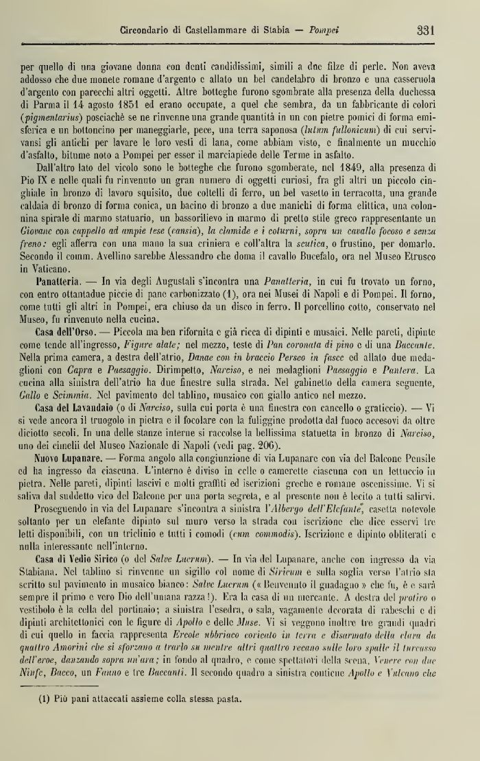 per quello di mia giovane donna eon denti candidissimi, simili a dne fdze di perle. Non aveva addosso che due monete romane d'argento e allato un bel candelabro di bronzo e una casseruola d'argento con parecchi altri oggetti. Altre botteghe furono sgombrate alla presenza della duchessa di Parma il 14 agosto 1851 ed erano occupate, a quel che sembra, da un fabbricante di colori (pigmentai'ius) posciachè se ne rinvenne una grande quantità in un con pietre pomici di forma emisferica e un bottoncino per maneggiarle, pece, una terra saponosa (hilum fullonicum) di cui servi-vansi gli antichi per lavare le loro vesti di lana, come abbiam visto, e lilialmente un mucchio d'asfalto, bitume noto a Pompei per esser il marciapiede delle. Terme in asfalto.