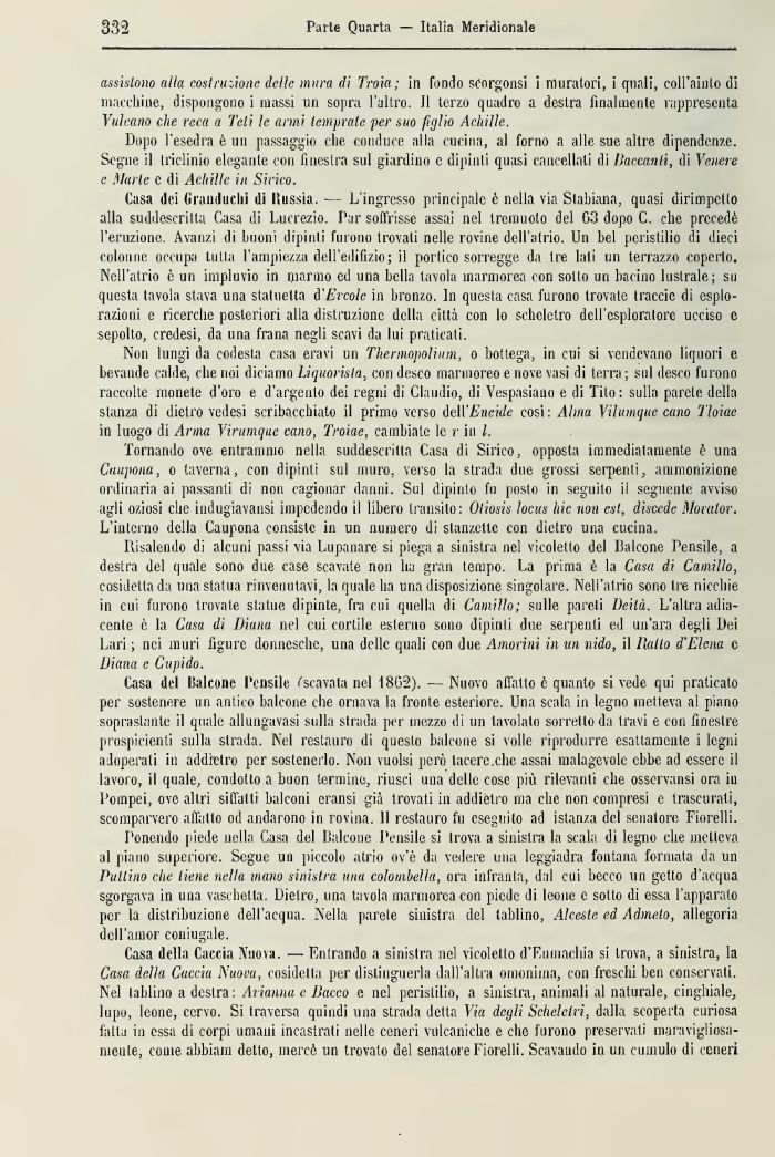 Casa dei (i rami urli! di Ilussia. — L'ingresso principale è nella via Stahiana, quasi dirimpetto alla suddescritta Casa di Lucrezio. Par soffrisse assai nel tremuoto del 03 dopo C. che preeedè l'eruzione. Avanzi di buoni dipinti furono trovati nelle rovine dell'atrio. Un bel peristilio di dieci colonne occupa tutta l'ampiezza dell'edifizio ; il portico sorregge da tre lati un terrazzo coperto. Nell'atrio è un impluvio in marmo ed una bella tavola marmorea con sotto un bacino lustrale; su questa tavola stava una statuetta d'Ercole in bronzo. In questa casa furono trovate traccio di esplorazioni e ricerche posteriori alla distruzione della città con lo scheletro dell'esploratore ucciso c sepolto, credesi, da una frana negli scavi da lui praticati.