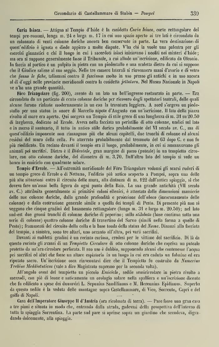 Fòro Triangolare (fig. 200), avente da un lato un bell'ingresso restauralo in parte — Era circondato da un porticato di cento colonne doriche per ricovero degli spettatori teatrali, delle quali alcune furono rialzate modernamente in un con la travatura leggiera. A nord s'ergeva un piedestallo per una statua in onore di Marcello nipote d'Augusto con un'iscrizione. Il lato della piazza rivolto al mare era aperto. Qui sorgeva un Tempio di stile greco di una lunghezza di in. 31 su 20.50 di larghezza, dedicato ad Ercole. Aveva nella facciata un peristilio di otto colonne, undici sul lato e in mezzo il santuario, il tutto in antico stile dorico probabilmente del VI secolo av. C., ma dì quest'edilizio imponente non rimangono più che alcuni capitelli, due tronchi di colonne ed alcuni residui del muro della cella. Fu atterrato probabilmente dal tremuoto del 03 dopo C. e non fu più riedificato. Un recinto davanti il tempio era il luogo, probabilmente, in cui si ammazzavano gli animali pei sacrifizi. Dietro è il Iìidenlale, gran inargine di pozzo (puteale) in un tempietto circolare, con otto colonne doriche, del diametro di ni. 3.70. Dall'altro lato del tempio si vede un banco in emiciclo con quadrante solare.