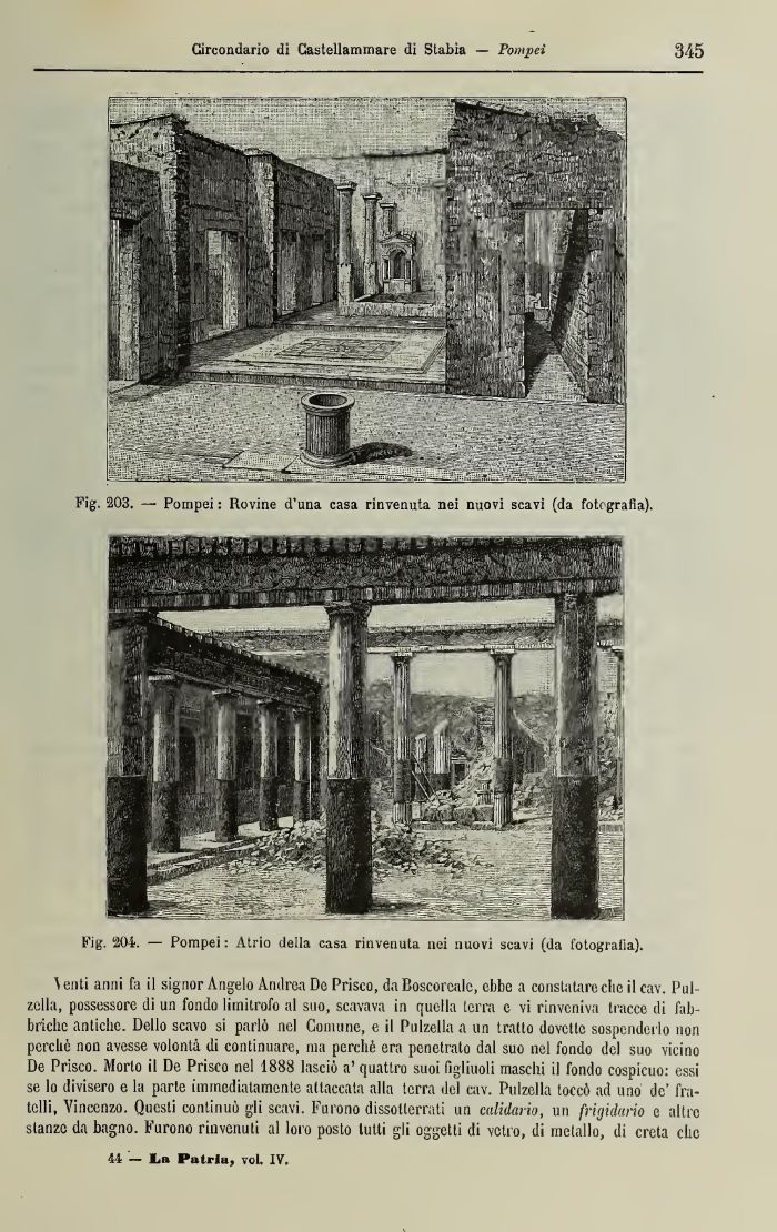 \ enti anni fa il signor Angelo Andrea De Prisco, da Boscoreale, ebbe a constatare che il cav. Pulzella, possessore di un fondo limitrofo al suo, scavava in quella terra e vi rinveniva tracce di fabbriche antiche. Dello scavo si parlò nel Comune, e il Pulzella a un tratto dovette sospenderlo non perchè non avesse volontà di continuare, ma perchè era penetrato dal suo nel fondo del suo vicino De Prisco. Morto il De Prisco nel 1888 lasciò a' quattro suoi figliuoli maschi il fondo cospicuo: essi se lo divisero e la parte immediatamente attaccata alla terra del cav. Pulzella toccò ad uno de' fratelli, Vincenzo. Questi continuò gli scavi. Furono dissotterrati un calidario, un frigidario e altre stanze da bagno. Furono rinvenuti al loro posto tutti gli oggetti di vetro, di metallo, di creta che