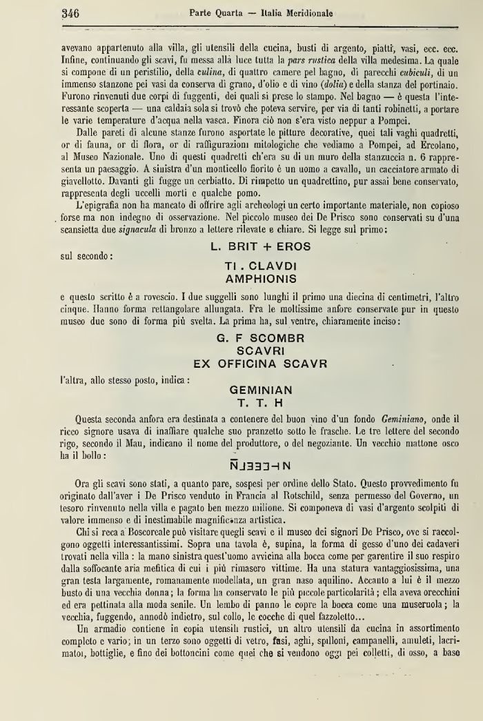 Ora gli scavi sono stati, a quanto pare, sospesi per ordine dello Stato. Questo provvedimento fu originato dall'aver i De Prisco venduto in Francia al Rotschild, senza permesso del Governo, un tesoro rinvenuto nella villa e pagato ben mezzo milione. Si componeva di vasi d'argento scolpiti di valore immenso e di inestimabile magnificenza artistica.