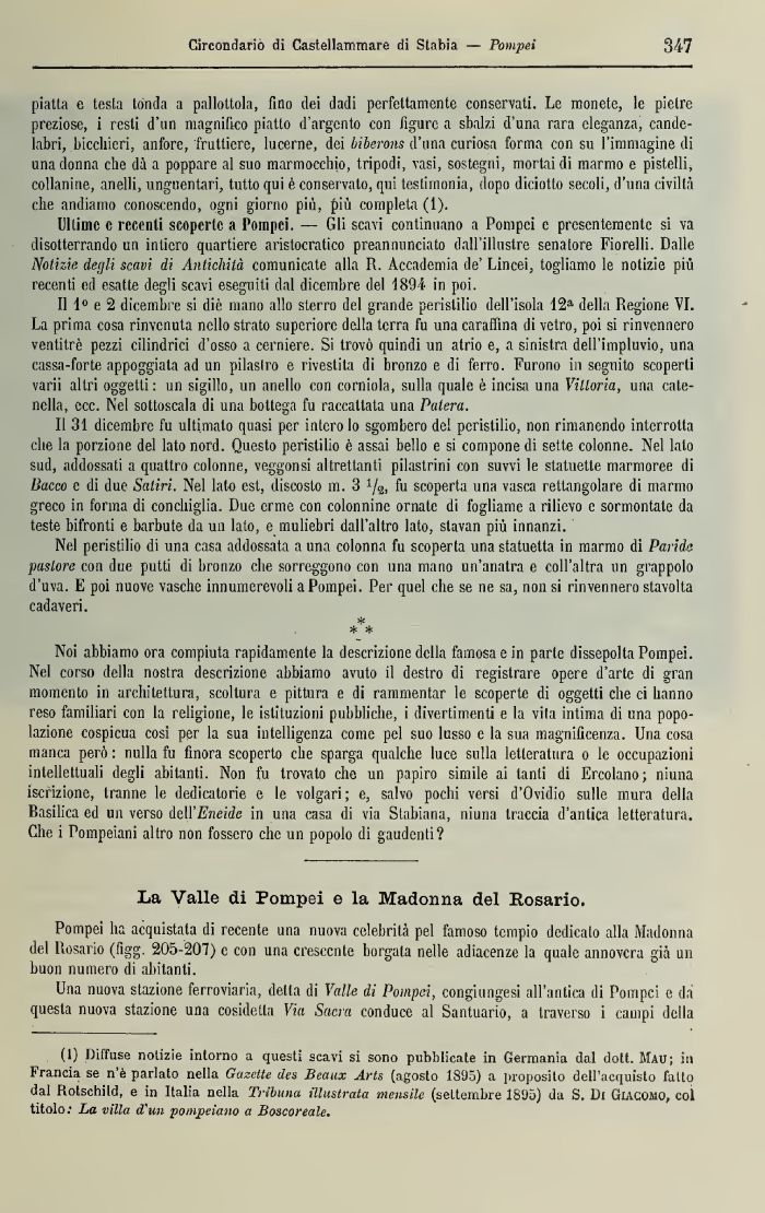 Pompei ha acquistata di recente una nuova celebrità pel famoso tempio dedicato alla Madonna del Rosario (figg. 203-207) e con una crescente borgata nelle adiacenze la quale annovera già un buon numero dì abitanti.
