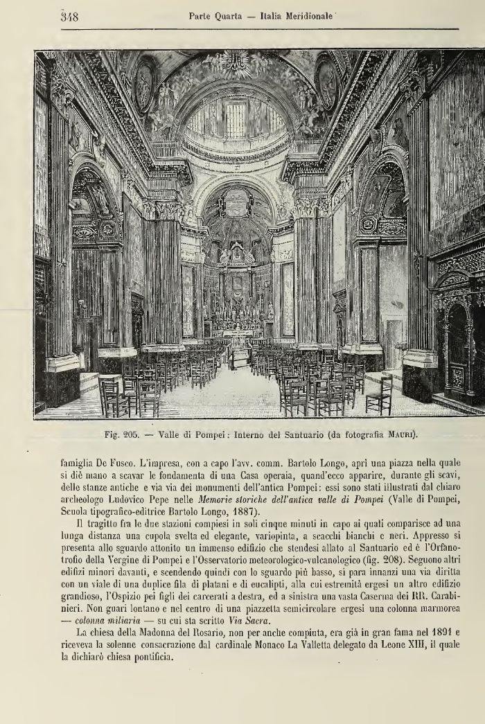 Il tragitto fra le due stazioni compiesi in soli cinque minuti in capo ai quali comparisce ad ima lunga distanza una cupola svelta ed elegante, variopinta, a scacchi bianchi c neri. Appresso si presenta allo sguardo attonito un immenso edilizio clic stendesi allato al Santuario ed è l'Orfanotrofio della Vergine di Pompei e l'Osservatorio meteorologico-vulcanologico (lig. 208). Seguono altri edilìzi minori davanti, e scendendo quindi con lo sguardo più basso, si para innanzi una vìa diritta con un viale di una duplice fila di platani e di eucalipti, alla cui estremità ergesi un altro edilìzio grandioso, l'Ospizio pei figli dei carcerati a destra, ed a sinistra una vasta Caserma dei HIì. Carabinieri. Non guari lontano e nel centro di una piazzetta semicircolare ergesi una colonna marmorea — colonna miliaria — su cui sta scritto Yia Sacra,