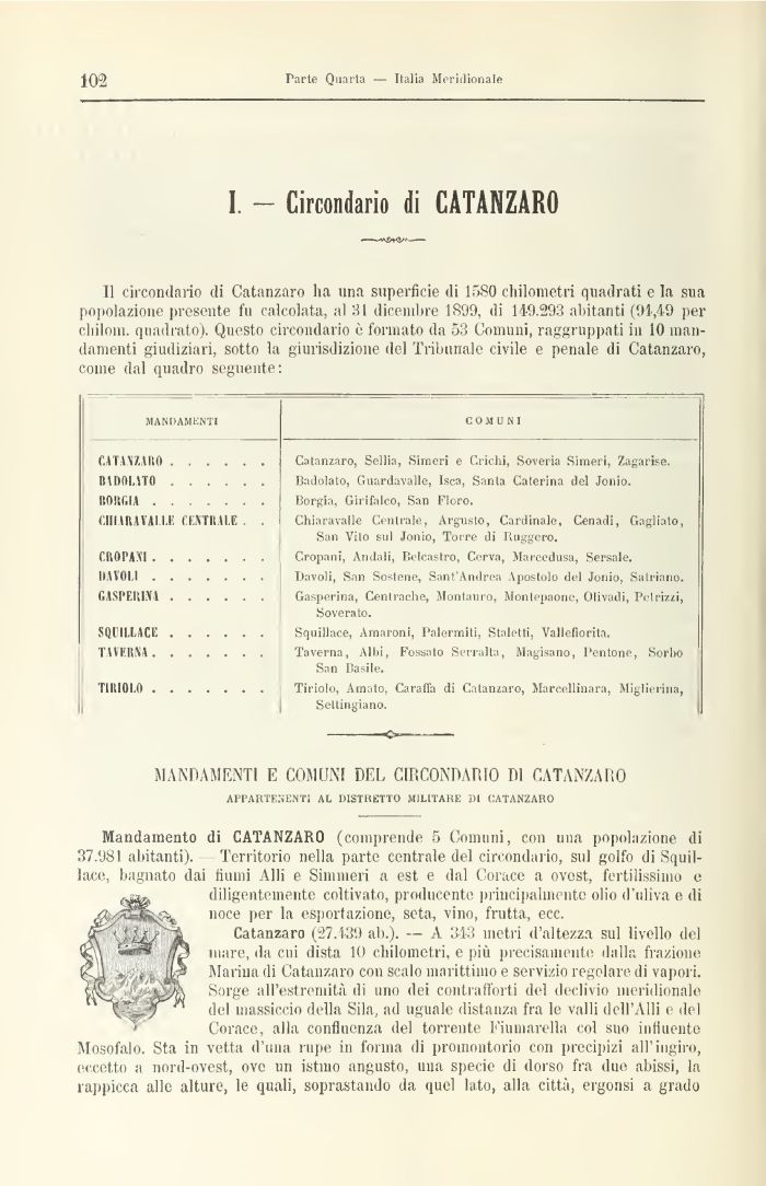 Mandamento di CATANZARO (comprende 5 Comuni, con una popolazione di 37.981 abitanti). Territorio nella parte centrale del circondario, sul golfo di Squillaee, bagnato dai fiumi Ali! e Sinimeri a est e dal Corace a ovest, fertilissimo e diligentemente coltivato, producente principalmente olio d'uliva e di noce per la esportazione, seta, vino, frutta, ecc.