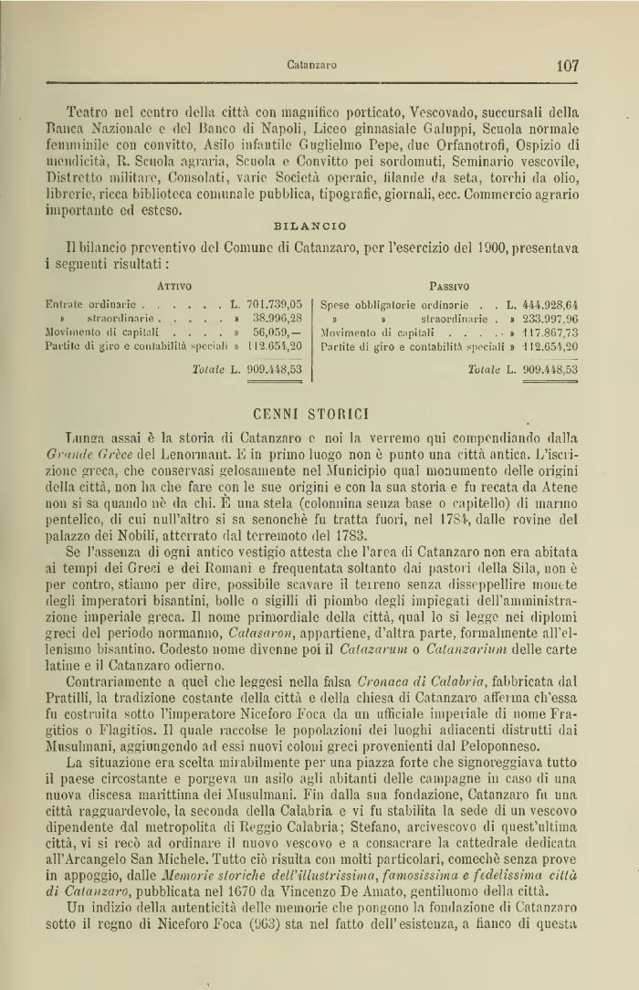Il bilancio preventivo del Comune di Catanzaro, per l'esercizio del 1900, presentava i seguenti risultati :