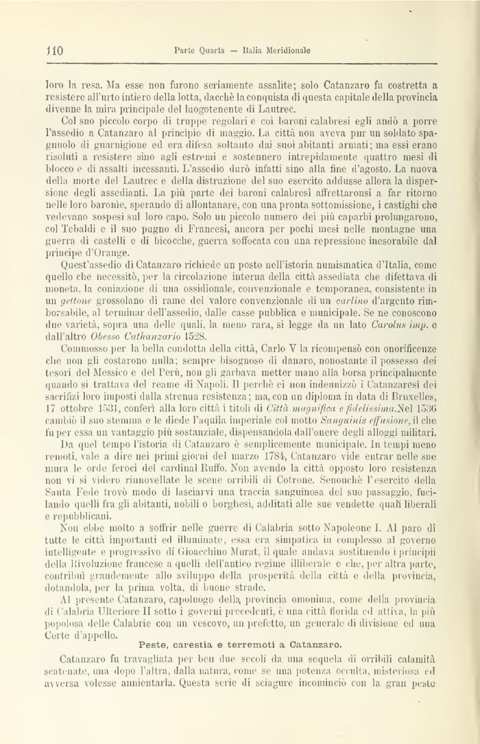 Quest'assedio di Catanzaro richiede un posto noli istoria numismatica d'Italia, come quello che necessitò, per la circolazione interna della città assediata che difettava di moneta, la coniazione di una ossidionale, convenzionale e temporanea, consistente in un gettone grossolano di rame del valore convenzionale di un carlino d'argento rimborsabile, al terminai- dell'assedio, dalle casse pubblica e municipale. Se ne conoscono due varietà, sopra una delle quali, la meno rara, si legge da un lato Carolus imp. e dall'altro Obesso Cathanzario 1528.