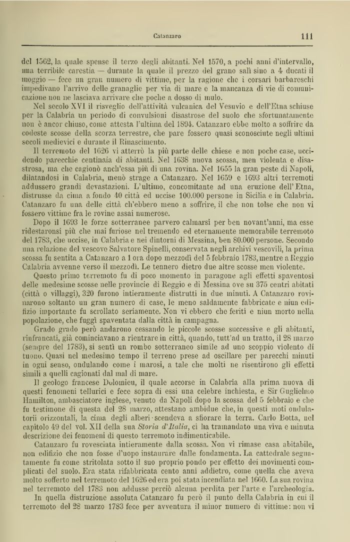 Dopo il 1693 le forze sotterranee parvero calmarsi per ben novantanni, ma esse ridestaronsi più che mai furiose nel tremendo ed eternamente memorabile terremoto del 1783, che uccise, in Calabria e nei dintorni di Messina, ben 80.000 persone. Secondo una relazione del vescovo Salvatore Spinelli, conservata negli archivi vescovili, la prima scossa fu sentita a Catanzaro a 1 ora dopo mezzodì del 5 febbraio 1783, mentre a Reggio Calabria avvenne verso il mezzodì. Le tennero dietro due altre scosse meli violente.