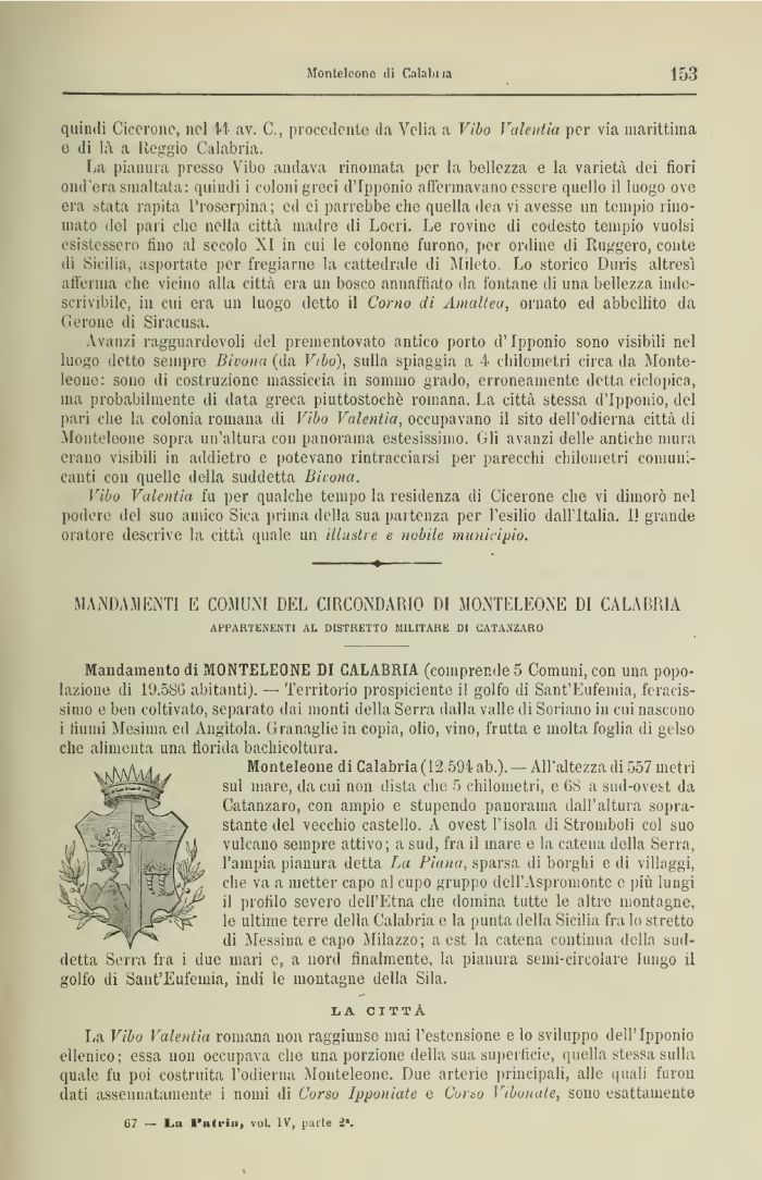 Mouteleoue di Calabria (12.594 ab.). — All'altezza di 557 metri sul mare, da cui non dista che 5 chilometri, e 6S a sud-ovest da Catanzaro, con ampio e stupendo panorama dall'altura soprastante del vecchio castello. A ovest l'isola di Stromboli col suo vulcano sempre attivo; a sud, fra il mare e la catena della Serra, l'ampia pianura detta La Piana, sparsa di borghi e di villaggi, die va a metter capo al cupo gruppo dell'Aspromonte e più lungi il profilo severo dell'Etna che domina tutte le altre montagne, le ultime terre della Calabria e la punta della Sicilia fra Io stretto di Messina e capo Milazzo; a est la catena continua della suddetta Serra fra i due mari e, a nord finalmente, la pianura semi-circolare lungo il golfo di Sant'Eufemia, indi le montagne della Sila.