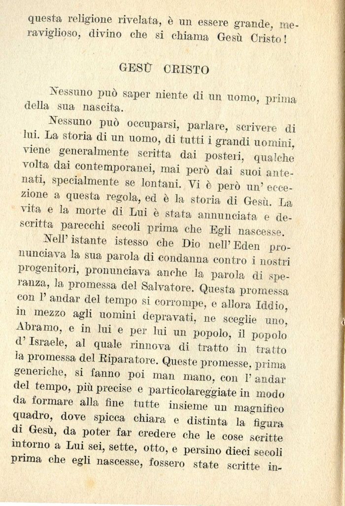 Nessuno può occuparsi, parlare, scrivere di lui. La storia di un uomo, di tutti i grandi uomini, viene generalmente scritta dai posteri, qualche volta dai contemporanei, mai però dai suoi antenati, specialmente se lontani. Vi è però un' eccezione a questa regola, ed è la storia di Gesù. La vita e la morte di Lui è stata annunciata e descritta parecchi secoli prima che Egli nascesse.
