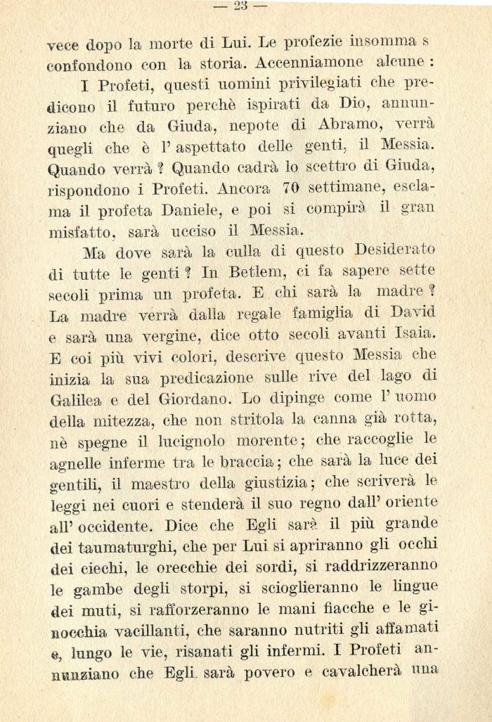 Ma dove sarà la culla di questo Desiderato di tutte le genti ? In Betlem, ci fa sapere sette secoli prima un profeta. E chi sarà la madre ? La madre verrà dalla regale famiglia di David e sarà una vergine, dice otto secoli avanti Isaia. E coi più vivi colori, descrive questo Messia che inizia la sua predicazione sulle rive del lago di Galilea e del Giordano. Lo dipinge come 1' uomo della mitezza, che non stritola la canna già rotta, nè spegne il lucignolo morente; che raccoglie le agnelle inferme tra le braccia ; che sarà la luce dei gentili, il maestro della giustizia; che scriverà le leggi nei cuori e stenderà il suo regno dall' oriente all' occidente. Dice che Egli sai'?, il più grande dei taumaturghi, che per Lui si apriranno gli occhi dei ciechi, le orecchie dei sordi, si raddrizzeranno le gambe degli storpi, si scioglieranno le lingue dei muti, si rafforzeranno le mani fiacche e le ginocchia vacillanti, che saranno nutriti gli affamati e, lungo le vie, risanati gli infermi. I Profeti annunziano che Egli, sarà povero e cavalcherà nua