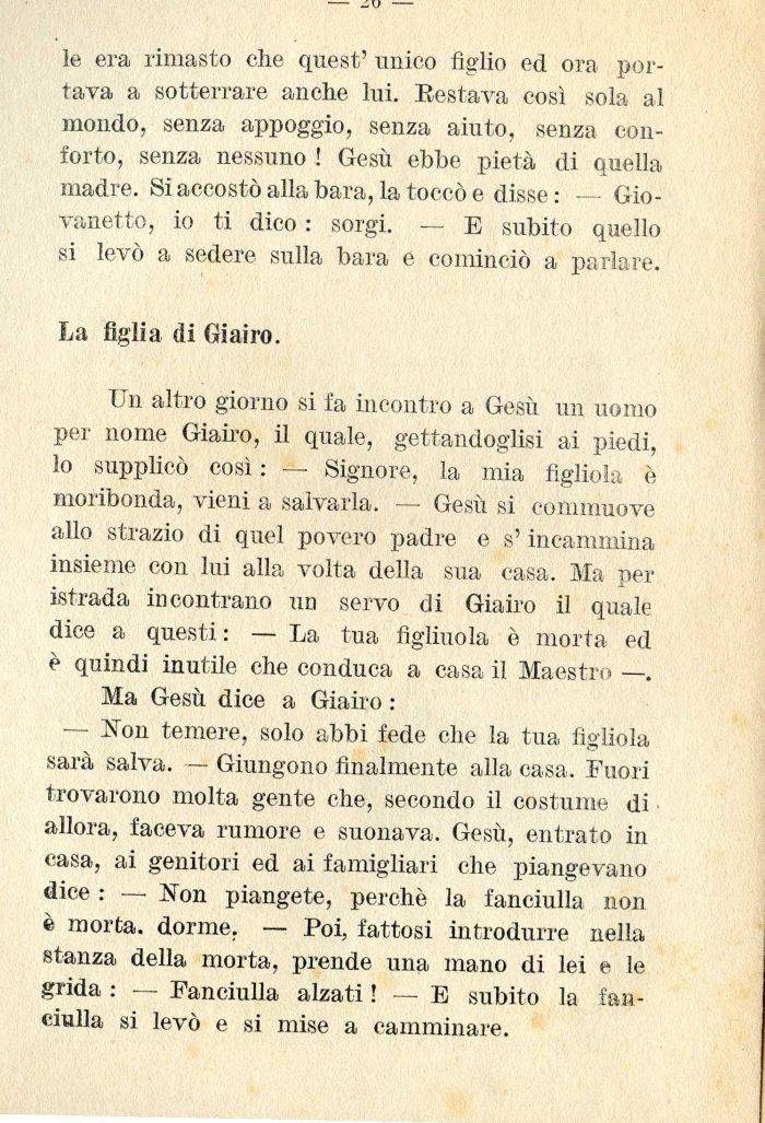 le era rimasto che quest' unico figlio ed ora portava a sotterrare anche lui. Restava così sola al mondo, senza appoggio, senza aiuto, senza conforto, senza nessuno ! Gesù ebbe pietà di quella madre. Si accostò alla bara, la toccò e disse : — Giovanetto, io ti dico : sorgi. — E subito quello si levò a sedere sulla bara e cominciò a parlare.