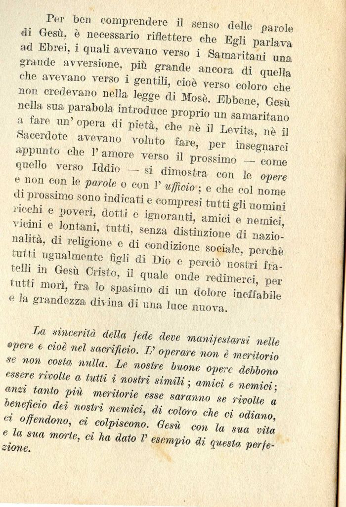 Per ben comprendere il senso delle parole di Gesù, è necessario riflettere che Egli parlava ad Ebrei, i quali avevano verso i Samaritani una grande avversione, più grande ancora di quella che avevano verso i gentili, cioè verso coloro che non credevano nella legge di Mose. Ebbene, Gesù nella sua parabola introduce proprio un samaritano a fare un' opera di pietà, che nè il Levita, nè il Sacerdote avevano voluto fare, per insegnarci appunto che 1' amore verso il prossimo — come quello verso Iddio — si dimostra con le opere e non con le parole o con 1' ufficio ; e che col nome di prossimo sono indicati e compresi tutti gli uomini ricchi e poveri, dotti e ignoranti, amici e nemici, vicini e lontani, tutti, senza distinzione di nazionalità, di religione e di condizione sociale, perchè tutti ugualmente figli di Dio e perciò nostri fratelli in Gesù Cristo, il quale onde redimerei, per tutti morì, fra lo spasimo di un dolore ineffabile e la grandezza divina di una luce nuova.