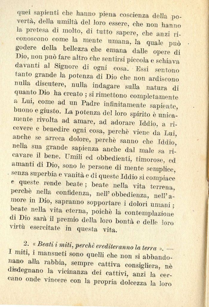 quei sapienti che hanno piena coscienza della povertà, della umiltà del loro essere, che non hanno la pretesa di molto, di tutto sapere, che anzi riconoscono come la mente umana, la quale può godere della bellezza che emana dalle opere di Dio, non può fare altro che sentirsi piccola e schiava davanti al Signore di ogni cosa. Essi sentono tanto grande la potenza di Dio che non ardiscono nulla discutere, nulla indagare sulla natura di quanto Dio ha creato ; si rimettono completamente a Lui, come ad un Padre infinitamente sapiente, buono e giusto. La potenza del loro spirito è unicamente rivolta ad amare, ad adorare Iddio, a ricevere e benedire ogni cosa, perchè viene da Lui, anche se arreca dolore, perchè sanno che Iddio, nella sua grande sapienza anche dal male sa ricavare il bene. Umili ed obbedienti, timorose, ed amanti di Dio, sono le persone di mente semplice, senza superbia e vanità e di queste Iddio si compiace e queste rende beate ; beate nella vita terrena, perchè nella confidenza, nell' obbedienza, nel!' a-more in Dio, sapranno sopportare i dolori umani : beate nella vita eterna, poiché la contemplazione di Dio sarà il premio della loro bontà e delle loro virtù esercitate in questa vita.