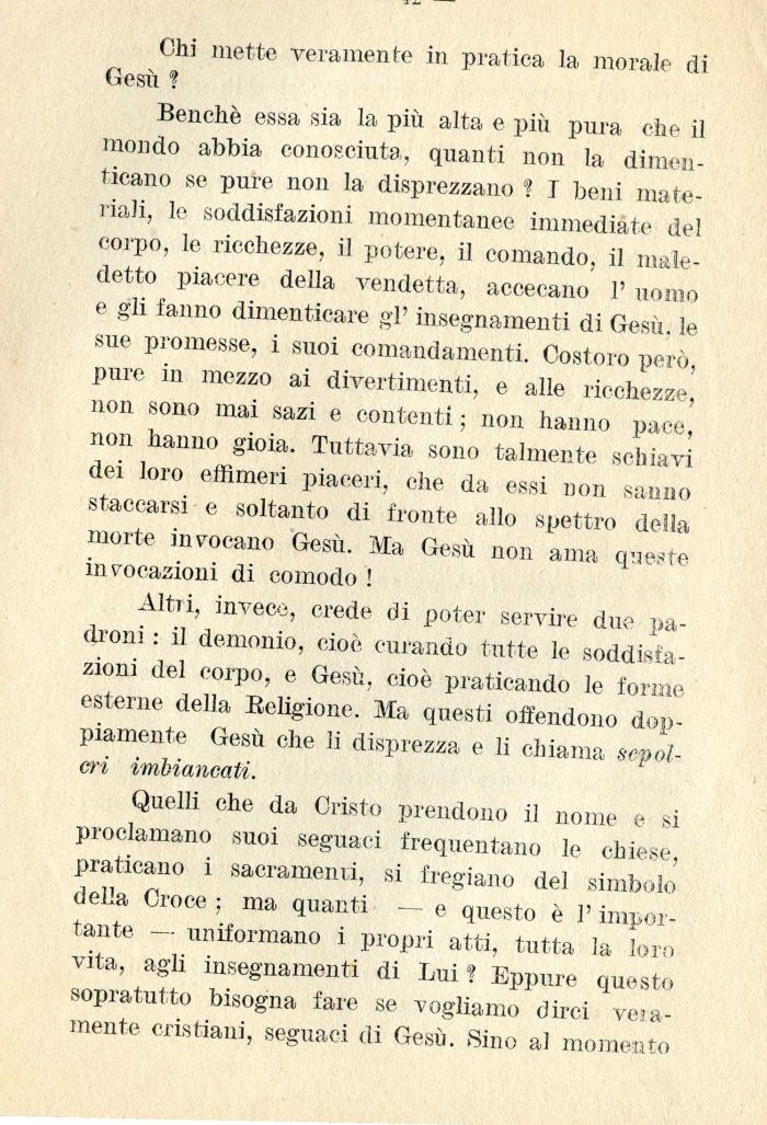 Benché essa sia la più alta e più pura che il mondo abbia conosciuta, quanti non la dimenticano se pure non la disprezzano ? I beni materiali, le soddisfazioni momentanee immediate del corpo, le ricchezze, il potere, il comando, il maledetto piacere della vendetta, accecano l'uomo e gli fanno dimenticare gl' insegnamenti di Gesù, le sue promesse, i suoi comandamenti. Costoro però, pure in mezzo ai divertimenti, e alle ricchezze, non sono mai sazi e contenti ; non hanno pace, non hanno gioia. Tuttavia sono talmente schiavi dei loro effìmeri piaceri, che da essi non sanno staccarsi e soltanto di fronte allo spettro della morte invocano Gesù. Ma Gesù non ama queste invocazioni di comodo !