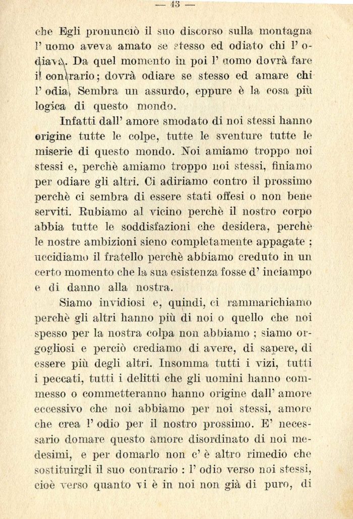 Infatti dall' amore smodato di noi stessi hanno origine tutte le colpe, tutte le sventure tutte le miserie di questo mondo. Noi amiamo troppo noi stessi e, perchè amiamo troppo noi stessi, finiamo per odiare gli altri. Ci adiriamo contro il prossimo perchè ci sembra di essere stati offesi o non beue serviti. Rubiamo al vicino perchè il nostro corpo abbia tutte le soddisfazioni che desidera, perché le nostre ambizioni sieno completamente appagate ; uccidiamo il fratello perchè abbiamo creduto in un certo momento che la sua esistenza fosse d'inciampo e di danno alla nostra.