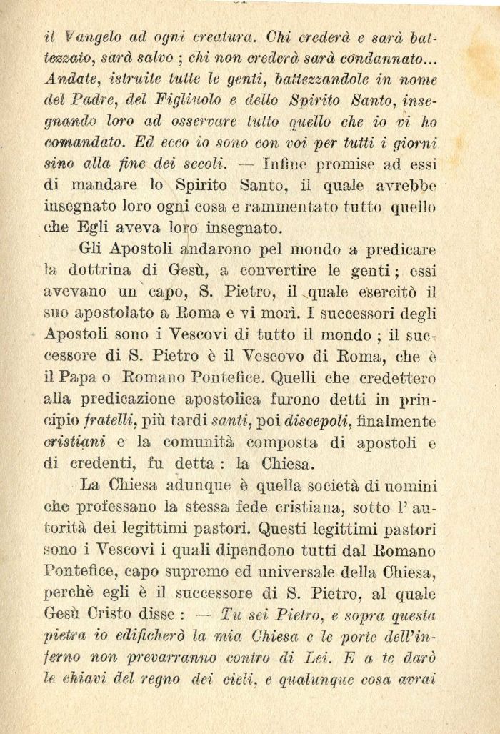 Gli Apostoli andarono pel mondo a predicare la dottrina di Gesù, a convertire le genti ; essi avevano un capo, S. Pietro, il quale esercitò il suo apostolato a Eoma e vi morì. I successori degli Apostoli sono i Vescovi di tutto il mondo ; il successore di S. Pietro è il Vescovo di Eoma, che ò il Papa o Romano Pontefice. Quelli che credettero alla predicazione apostolica furono detti in principio fratelli, più tardi santi, poi discepoli, finalmente cristiani e la comunità composta di apostoli e di credenti, fu detta : la Chiesa.
