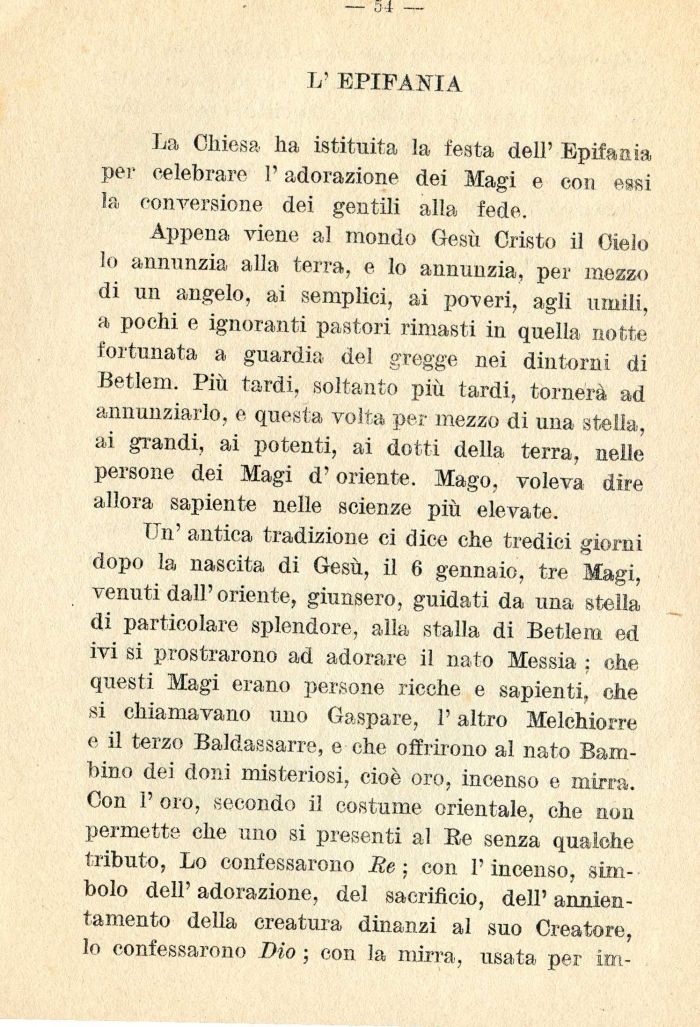 TTn' antica tradizione ci dice che tredici giorni dopo la nascita di Gesù, il 6 gennaio, tre Magi, venirti dall'oriente, giunsero, guidati da una stella di particolare splendore, alla stalla di Betlem ed ivi si prostrarono ad adorare il nato Messia : che questi Magi erano persone ricche e sapienti, che si chiamavano uno Gaspare, l'altro Melchiorre e il terzo Baldassarre, e che offrilo no al nato Bambino dei doni misteriosi, cioè oro, incenso e mirra. Con 1' oro, secondo il costume orientale, che non permette che uno si presenti al Re senza qualche tributo, Lo confessarono Ite ; con l'incenso, simbolo dell' adorazione, del sacrifìcio, dell' annientamento della creatura dinanzi al suo Creatore, lo confessarono Dio ; con la mirra, usata per im-