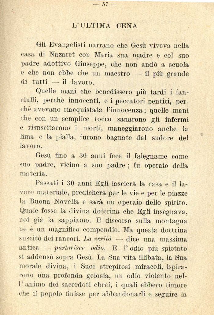 Quelle mani che benedissero più tardi i fanciulli, perchè innocenti, e i peccatori pentiti, perchè avevano riacquistata l'innocenza ; quelle mani che con un semplice tocco sanarono gli infermi e risuscitarono i morti, maneggiarono anche la lima e la pialla, furono bagnate dal sudore del lavoro.