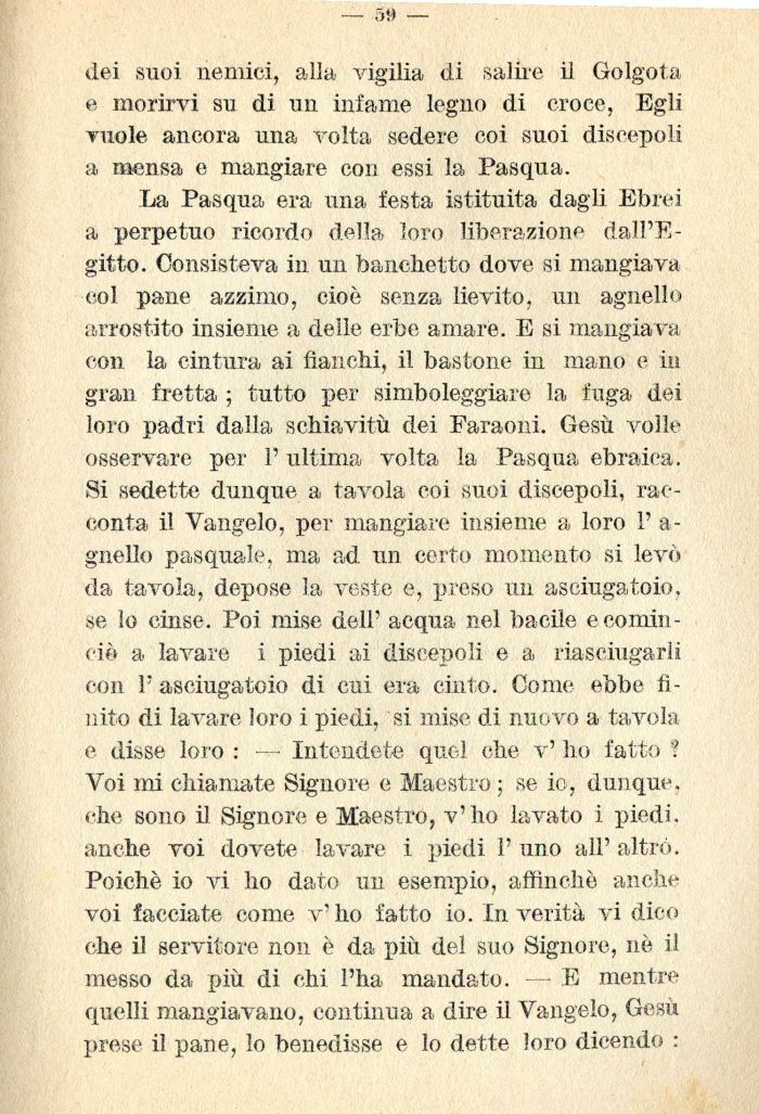 La Pasqua era una festa istituita dagli Ebrei a perpetuo ricordo della loro liberazione dall'Egitto. Consisteva in un banchetto dove si mangiava col pane azzimo, cioè senza lievito, un agnello arrostito insieme a delle erbe amare. E si mangiava con la cintura ai fianchi, il bastone in mano e in gran fretta ; tutto per simboleggiare la fuga dei loro padri dalla schiavitù dei Faraoni. Gesù volle osservare per l'ultima volta la Pasqua ebraica. Si sedette dunque a tavola coi suoi discepoli, rat -conta il Vangelo, per mangiare insieme a loro 1' a-gnello pasquale, ma ad un certo momento si levò da tavola, depose la veste e, preso un asciugatoio, se lo cinse. Poi mise dell' acqua nel bacile e cominciò a lavare i piedi ai discepoli e a riasciugarli con 1' asciugatoio di cui era cinto. Come ebbe finito di lavare loro i piedi, si mise di nuovo a tavola e disse loro : — Intendete quc-1 che v' ho fatto ? Voi mi chiamate Signore e Maestro ; se io, dunque, che sono il Signore e Maestro, v'ho lavato i piedi, anche voi dovete lavare i piedi 1' uno all' altro. Poiché io vi ho dato un esempio, affinchè anche voi facciate come v'ho fatto io. In verità vi dico che il servitore non è da più del suo Signore, nè il messo da più di chi l'ha mandato. E mentre quelli mangiavano, continua a dire il Vangelo, Gesù prese il pane, lo benedisse e lo dette loro dicendo :