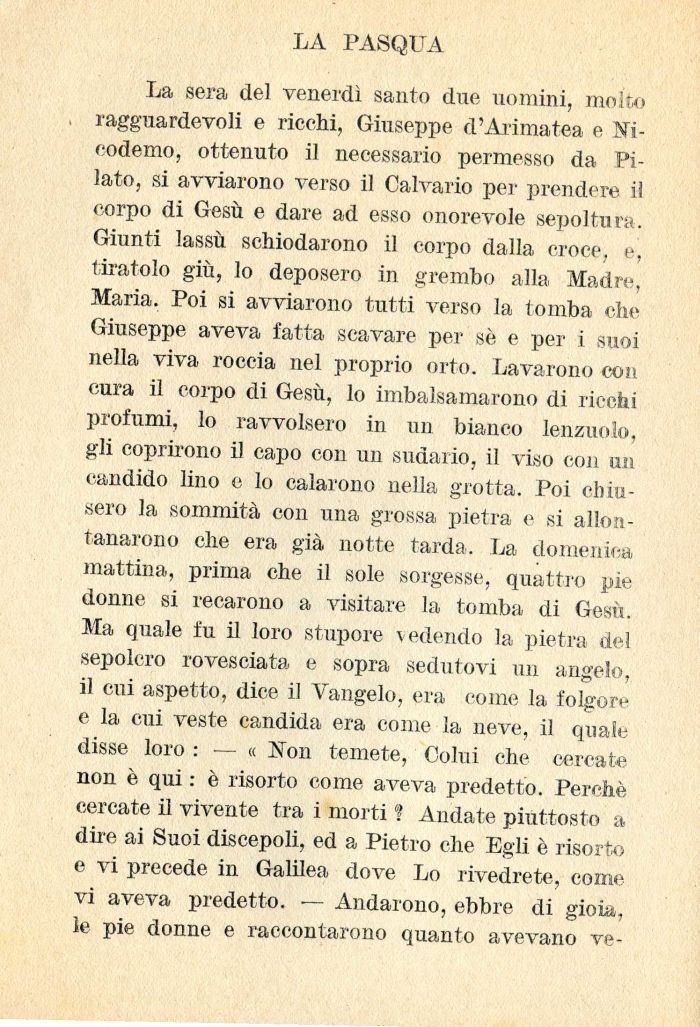 La sera del venerdì santo due uomini, molto ragguardevoli e ricchi, Giuseppe d'Arimatea e Ni-codemo, ottenuto il necessario permesso da Pilato, si avviarono verso il Calvario per prendere il corpo di Gesù e dare ad esso onorevole sepoltura. Giunti lassù schiodarono il corpo dalla croce, e, tiratolo giù, lo deposero in grembo alla Madre, Maria. Poi si avviarono tutti verso la tomba che Giuseppe aveva fatta scavare per sè e per i suoi nella viva roccia nel proprio orto. Lavarono con cura il corpo di Gesù, lo imbalsamarono di ricchi profumi, lo ravvolsero in un bianco lenzuolo, gli coprirono il capo con un sudario, il viso con un candido lino e lo calarono nella grotta. Poi chiusero la sommità con una grossa pietra e si allontanarono che era già notte tarda. La domenica mattina, prima che il sole sorgesse, quattro pie donne si recarono a visitare la tomba di Gesù. Ma quale fu il loro stupore vedendo la pietra del sepolcro rovesciata e sopra sedutovi un angelo, il cui aspetto, dice il Vangelo, era come la folgore e la cui veste candida era come la neve, il quale disse loro : — « Non temete, Colui che cercate non è qui : è risorto come aveva predetto. Perchè cercate il vivente tra i morti ? Andate piuttosto a dire ai Suoi discepoli, ed a Pietro che Egli è risorto e vi precede in Galilea dove Lo rivedrete, come vi aveva predetto. — Andarono, ebbre di gioia, le pie donne e raccontarono quanto avevano ve-