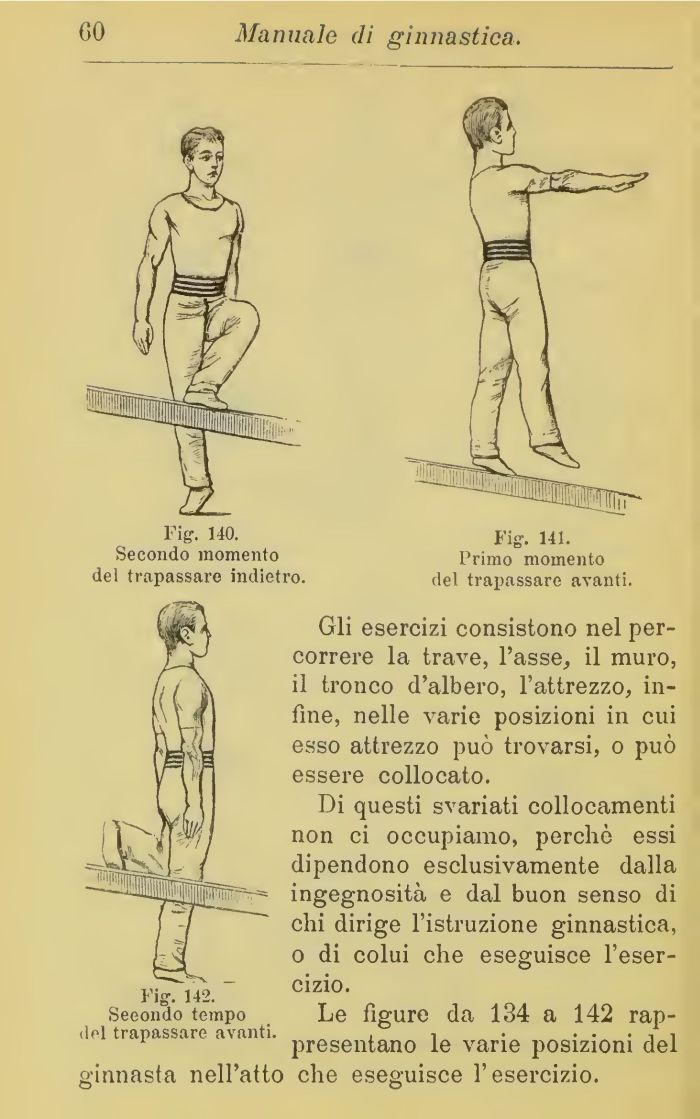 Gli esercizi consistono nel percorrere la trave, l'asse, il muro, il tronco d'albero, l'attrezzo, infine, nelle varie posizioni in cui esso attrezzo può trovarsi, o può essere collocato.
