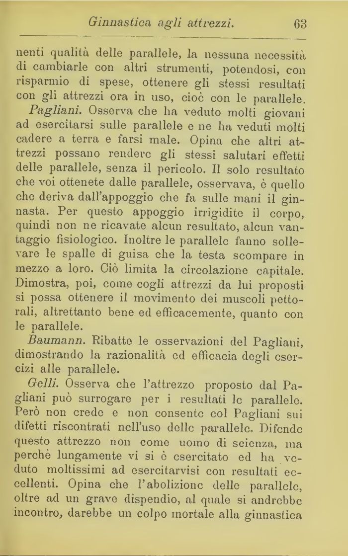Pagliani. Osserva che ha veduto molti giovani ad esercitarsi sulle parallele e ne ha veduti molti cadere a terra e farsi male. Opina che altri attrezzi possano rendere gli stessi salutari effetti delle parallele, senza il pericolo. Il solo resultato che voi ottenete dalle parallele, osservava, è quello che deriva dall'appoggio che fa sulle mani il ginnasta. Per questo appoggio irrigidite il corpo, quindi non ne ricavate alcun resultato, alcun vantaggio fisiologico. Inoltre le parallele fanno sollevare le spalle di guisa che la testa scompare in mezzo a loro. Ciò limita la circolazione capitale. Dimostra, poi, come cogli attrezzi da lui proposti si possa ottenere il movimento dei muscoli pettorali, altrettanto bene ed efficacemente, quanto con le parallele.
