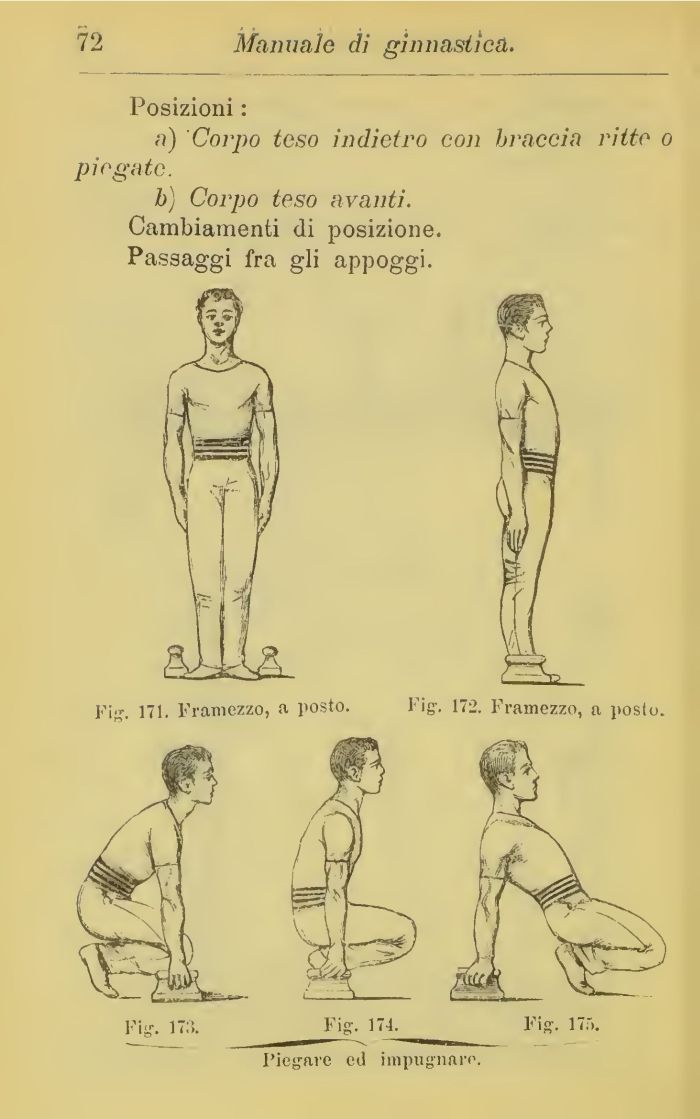 72 Manuale eli ginnastica. Posizioni : n) Corpo teso indietro con braccia ritto o piegate. b) Corpo teso avanti. Cambiamenti di posizione. Passaggi fra gli appoggi. Piegare ed impugnare.