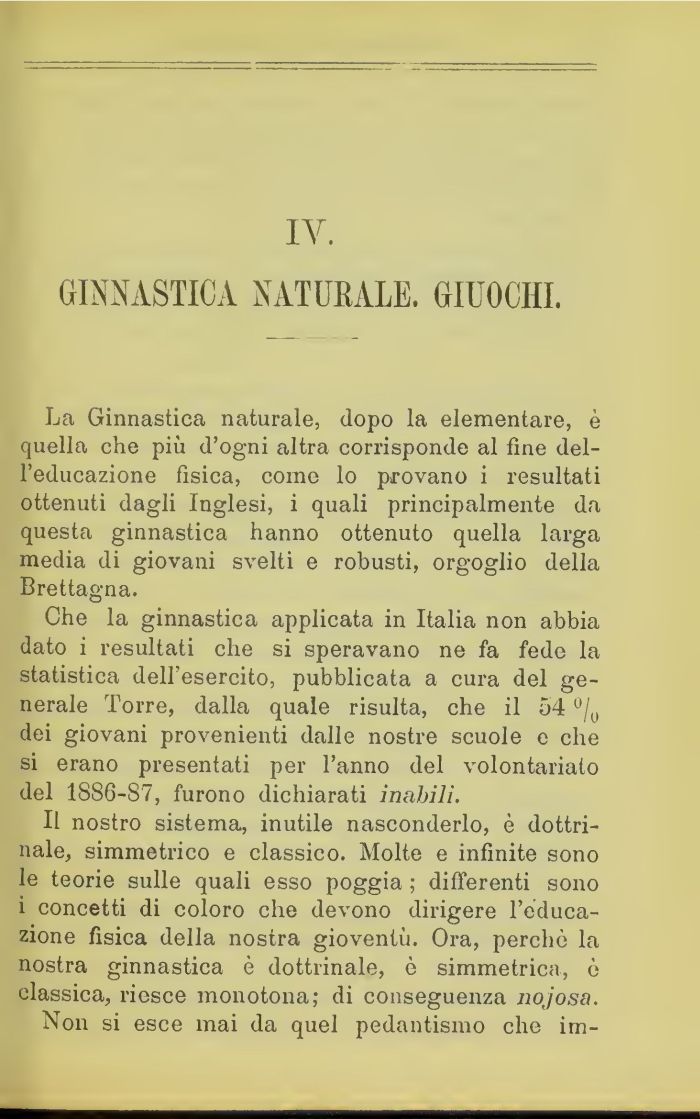 Il nostro sistema, inutile nasconderlo, č dottrinale, simmetrico e classico. Molte e infinite sono le teorie sulle quali esso poggia ; differenti sono i concetti di coloro che devono dirigere l'educazione fisica della nostra gioventų. Ora, perchč la nostra ginnastica č dottrinale, č simmetrica, ō classica, riesce monotona; di conseguenza nojosa.