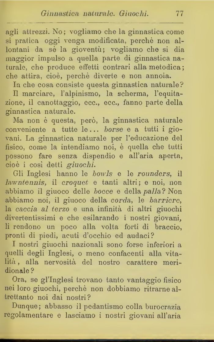 Gli Inglesi hanno le bowlà e lo rounders, il laxvntennis, il croquet e tanti altri; e noi, non abbiamo il giuoco delle bocce e della palla? Non abbiamo noi, il giuoco della corda, le barriere, la caccia al terzo e una infinità di altri giuochi divertentissimi e che esilarando i nostri giovani, li rendono un poco alla volta forti di braccio, pronti di piedi, acuti d'occhio ed audaci?