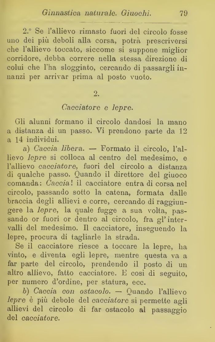 a) Caccia libera. — Formato il circolo, l'allievo lepre si colloca al centro del medesimo, e l'allievo cacciatore, fuori del circolo a distanza di qualche passo. Quando il direttore del giuoco comanda: Cacciai il cacciatore entra di corsa nel circolo, passando sotto la catena, formata dalle braccia degli allievi e corre, cercando di raggiungere la lepre, la quale fugge a sua volta, passando or fuori or dentro al circolo, fra gì' intervalli del medesimo. Il cacciatore, inseguendo la lepre, procura di tagliarle la strada.