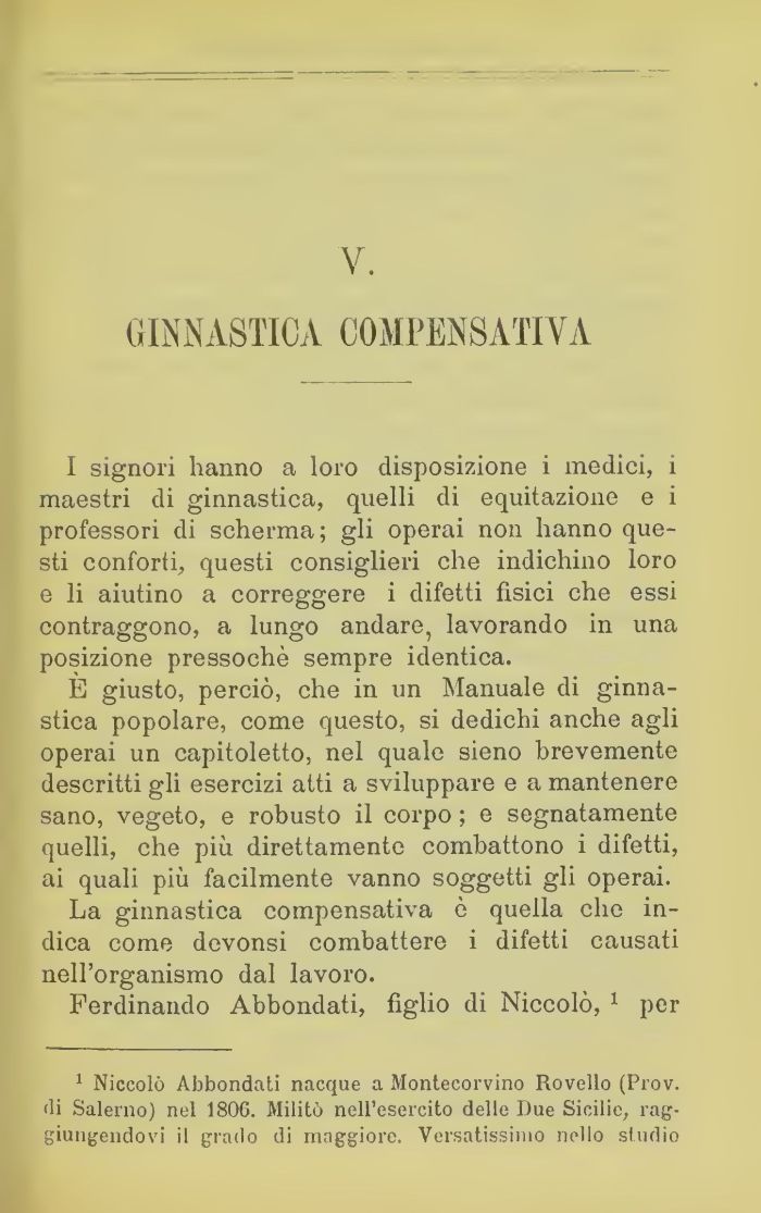 I signori hanno a loro disposizione i medici, i maestri di ginnastica, quelli di equitazione e i professori di scherma; gli operai non hanno questi conforti, questi consiglieri che indichino loro e li aiutino a correggere i difetti fisici che essi contraggono, a lungo andare, lavorando in una posizione pressoché sempre identica.