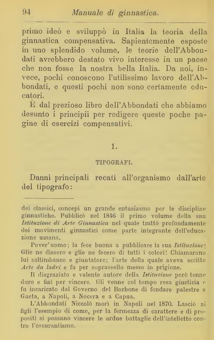 primo ideò e sviluppò in Italia la teoria della ginnastica compensativa. Sapientemente esposte in uno splendido volume, le teorie dell'Abbondati avrebbero destato vivo interesse in un paese che non fosse la nostra bella Italia. Da noi, invece, pochi conoscono l'utilissimo lavoro dell'Abbondati, e questi pochi non sono certamente educatori.