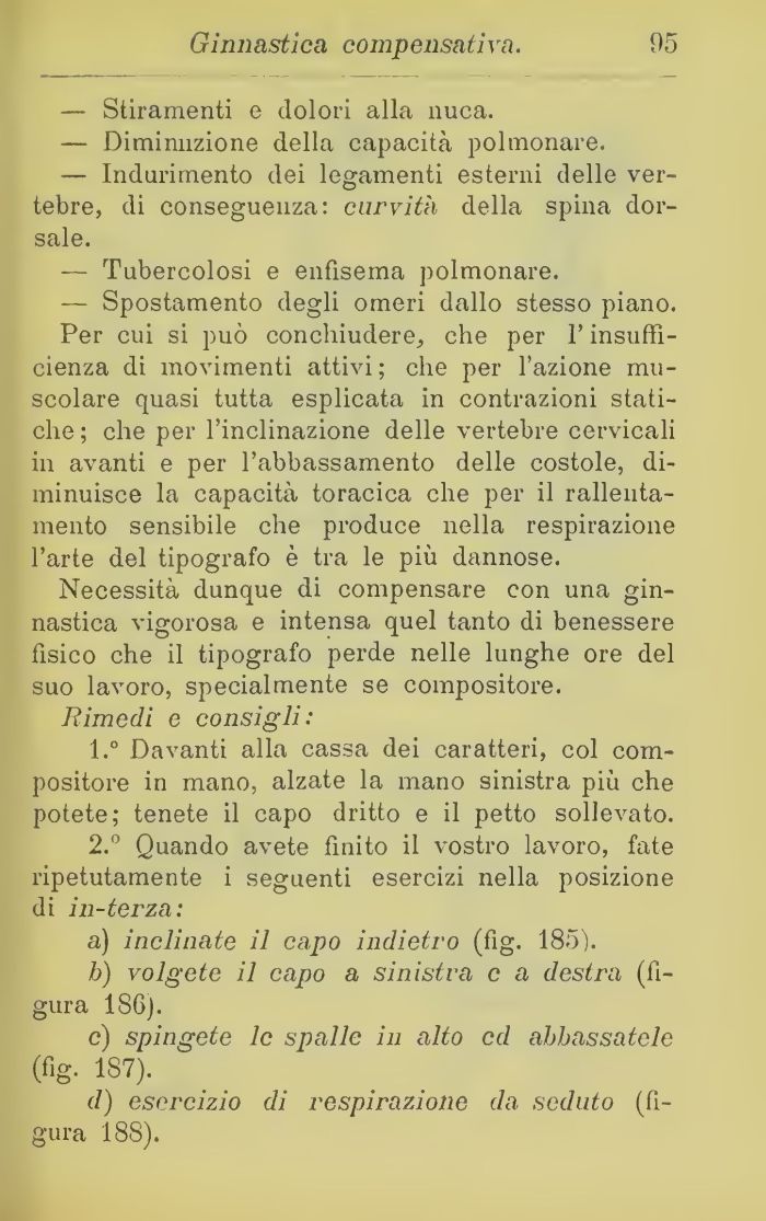 Necessità dunque di compensare con una ginnastica vigorosa e intensa quel tanto di benessere fisico che il tipografo perde nelle lunghe ore del suo lavoro, specialmente se compositore.