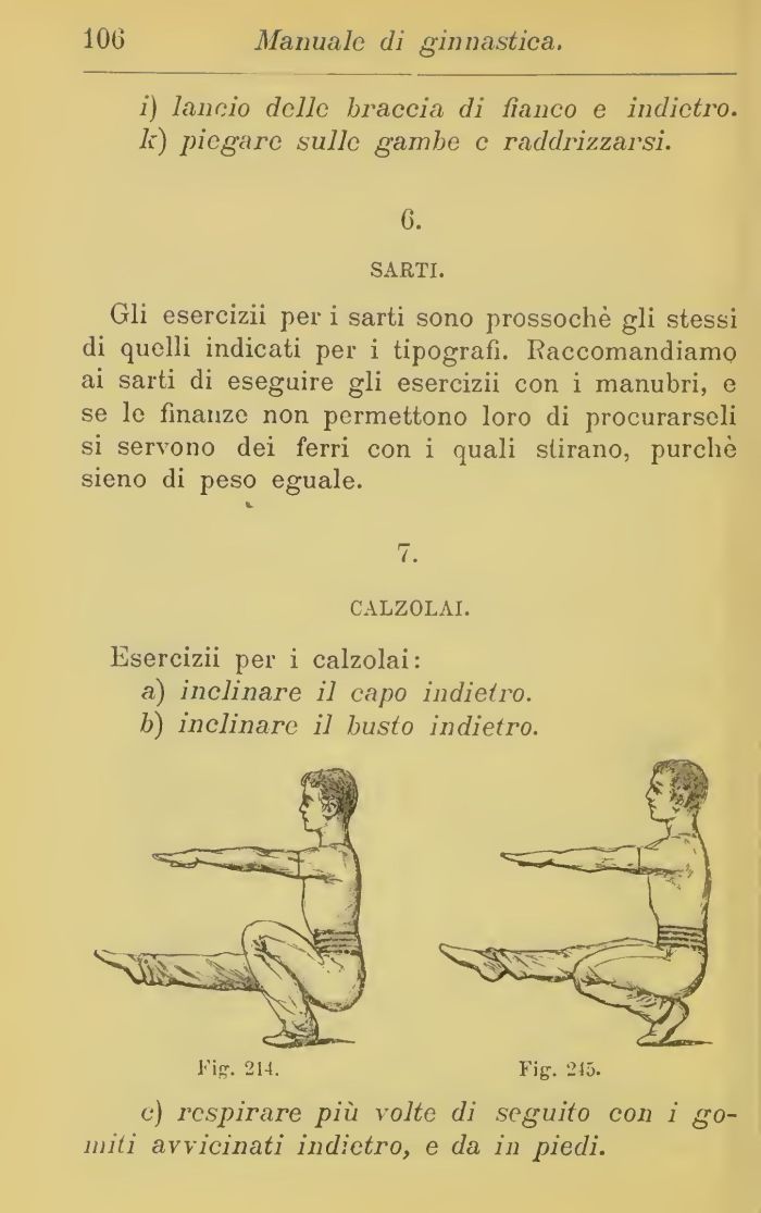Gli esercizii per 1 sarti sono prossochè gli stessi di quelli indicati per i tipografi. Raccomandiamo ai sarti di eseguire gli esercizii con i manubri, e se le finanze non permettono loro di procurarseli si servono dei ferri con i quali stirano, purché sieno di peso eguale.