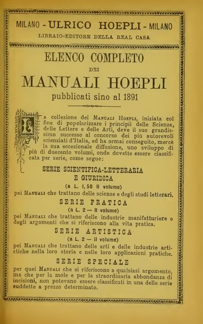 collezione dei Mandali Hoepli, iniziata col t fine di popolarizzare i principii delle Scienze, * gifi^l^- delle Lettere e delle Arti, deve il suo grandis-£ jlbBtasJr simo successo al concorso dei più autorevoli i1 Mt^v scienziati d'Italia, ed ha ormai conseguito, mercè £ B ' la sua eccezionale diffusione, uno sviluppo di 2 , più di duecento volumi, onde dovette essere classifi-^ À cata per serie, come segue: