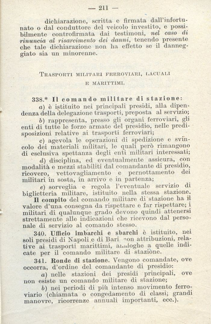 340. Ufficio imbarchi e sbarchi è istituito, nei soli presidi di Napoli e di Bari 'ori attribuzioni, relative ai trasporti marittimi, analoghe a quelle indicate per il comando militare di stazióne.