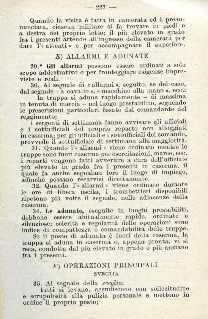 34. Le adunate, eseguite in luoghi prestabiliti, debbono essere abitualmente rapide, ordinate e silenziose; celerità e regolarità delle operazioni sono indice di compattezza e comandabilità delle truppe.
