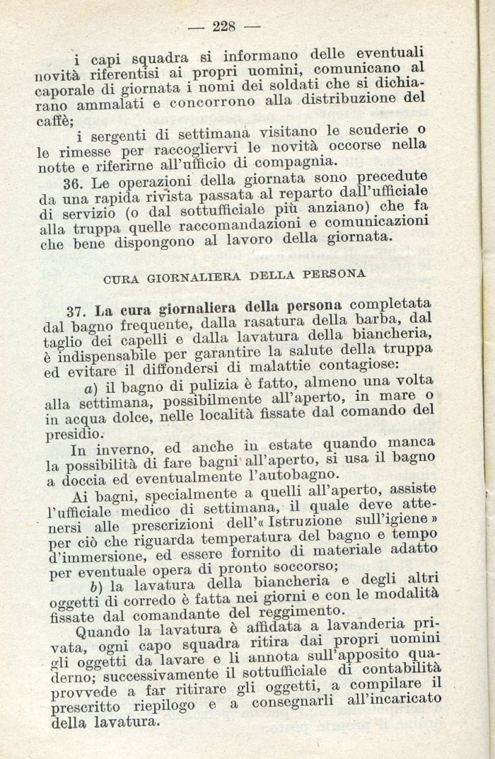 37. La cura giornaliera della persona completata dal bagno frequente, dalla rasatura della barba, dal taglio dei capelli e dalla lavatura della biancheria, è indispensabile per garantire la salute della truppa ed evitare il diffondersi di malattie contagiose: