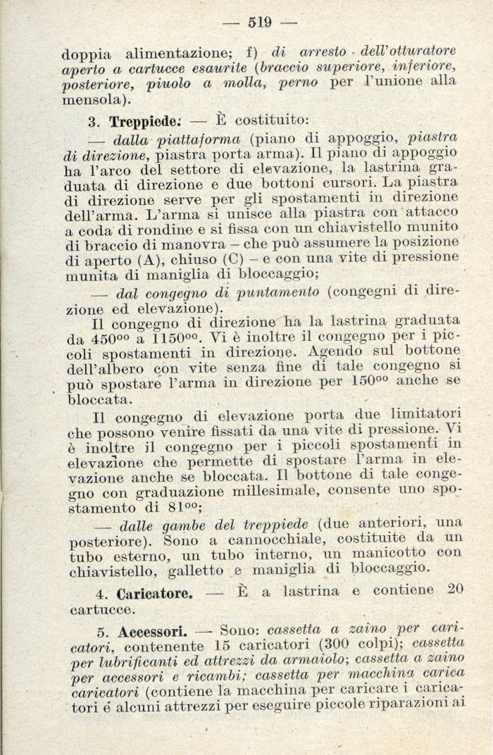 5. Accessori. — Sono: cassetta a zaino per caricatori, contenente 15 caricatori (300 colpi); cassetta per lubrificanti ed attrezzi da armatolo; cassetta a zaino per accessori e ricambi; cassetta per macchina carica caricatori (contiene la macchina per caricare i caricatori é alcuni attrezzi per eseguire piccole riparazioni ai