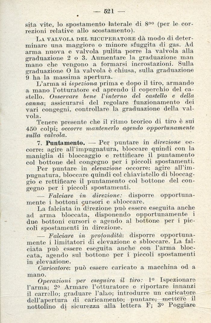 7. Puntamento. —¦ Per puntare in direzione occorre: agire all'impugnatura, bloccare quindi con la maniglia di bloccaggio e rettificare il puntamento col bottone del congegno per i piccoli spostamenti.
