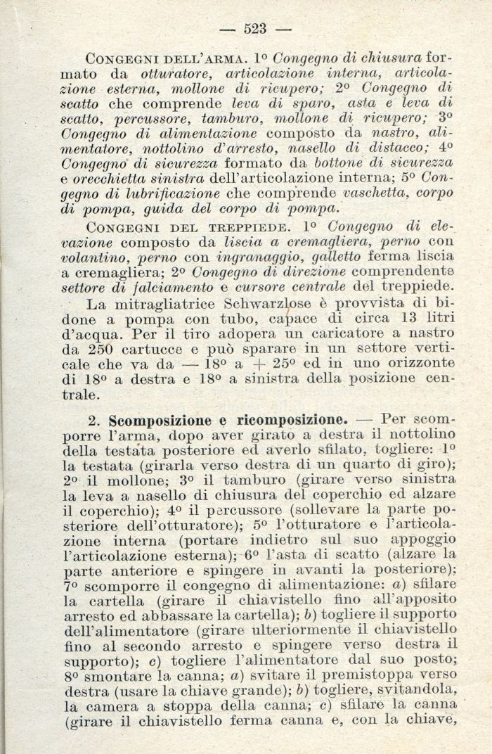 2. Scomposizione e ricomposizione. — Per scomporre l'arma, dopo aver girato a destra il nottolino della testata posteriore ed averlo sfilato, togliere: 1° la testata (girarla verso destra di un quarto di giro); 2° il mollone; 3° il tamburo (girare verso sinistra la leva a nasello di chiusura del coperchio ed alzare il coperchio); 4° il percussore (sollevare la parte posteriore dell'otturatore); 5° l'otturatore e l'articolazione interna (portare indietro sul suo appoggio l'articolazione esterna); 6° l'asta di scatto (alzare la parte anteriore e spingere in avanti la posteriore); 7° scomporre il congegno di alimentazione: a) sfilare la cartella (girare il chiavistello fino all'apposito arresto ed abbassare la cartella); b) togliere il supporto dell'alimentatore (girare ulteriormente il chiavistello fino al secondo arresto e spingere verso destra il supporto); c) togliere l'alimentatore dal suo posto; 8° smontare la canna; a) svitare il premistoppa verso destra (usare la chiave grande); b) togliere, svitandola, la camera a stoppa della canna; c) sfilare la canna (girare il chiavistello ferma canna e, con la chiave,