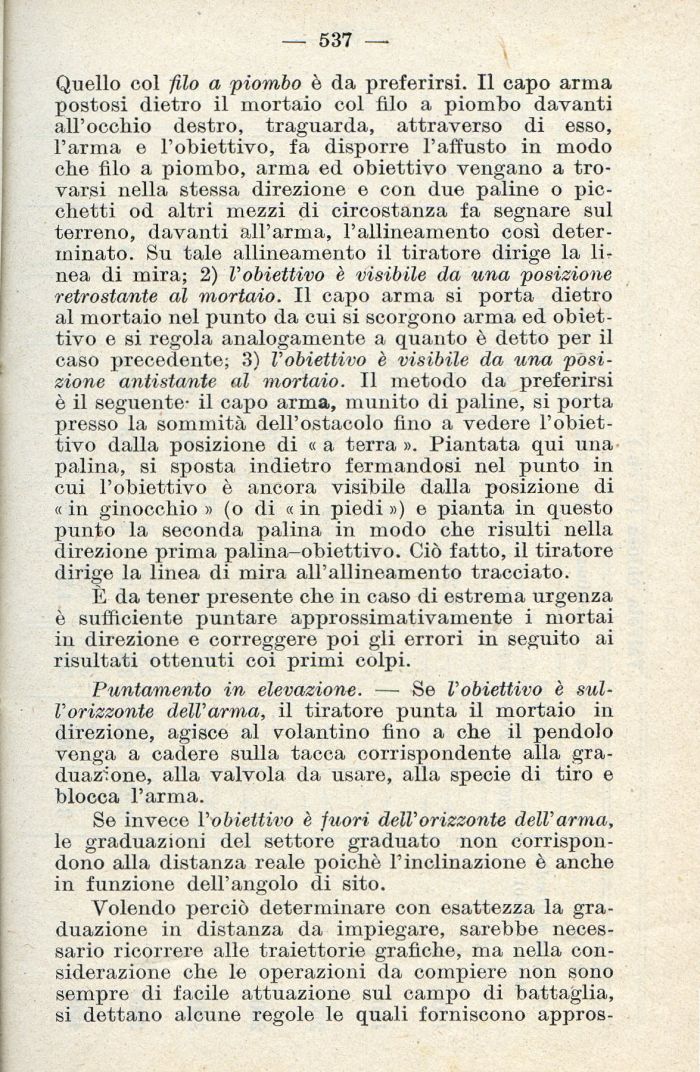 Quello col filo a piombo ò da preferirsi. Il capo arma postosi dietro il mortaio col filo a piombo davanti all'occhio destro, traguarda, attraverso di esso, l'arma e l'obiettivo, fa disporre l'affusto in modo che filo a piombo, arma ed obiettivo vengano a trovarsi nella stessa direzione e con due paline o picchetti od altri mezzi di circostanza fa segnare sul terreno, davanti all'arma, l'allineamento così determinato. Su tale allineamento il tiratore dirige la linea di mira; 2) l'obiettivo è visibile da una posizione retrostante al mortaio. Il capo arma si porta dietro al mortaio nel punto da cui si scorgono arma ed obiettivo e si regola analogamente a quanto è detto per il caso precedente; 3) l'obiettivo è visibile da una posizione antistante al mortaio. Il metodo da preferirsi è il seguente- il capo arma, munito di paline, si porta presso la sommità dell'ostacolo fino a vedere l'obiettivo dalla posizione di « a terra ». Piantata qui una palina, si sposta indietro fermandosi nel punto in cui l'obiettivo è ancora visibile dalla posizione di « in ginocchio » (o di « in piedi ») e pianta in questo punto la seconda palina in modo che risulti nella direzione prima palina-obiettivo. Ciò fatto, il tiratore dirige la linea di mira all'allineamento tracciato.