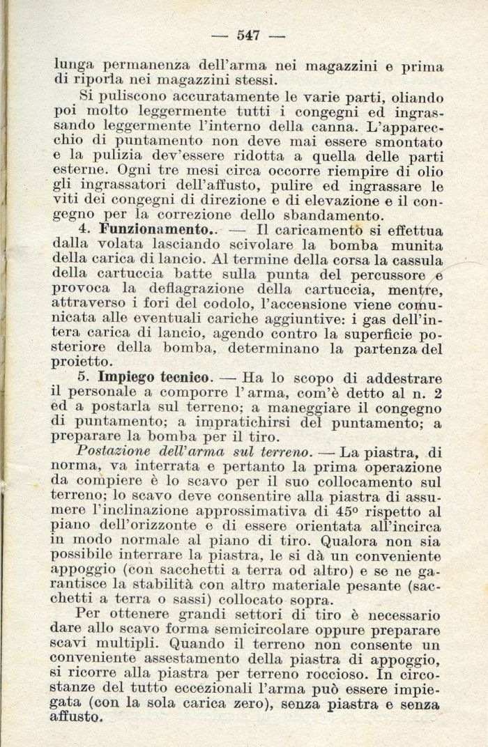 5. Impiego tecnico. — Ha lo scopo di addestrare il personale a comporre l'arma, com'è detto al n. 2 ed a postarla sul terreno; a maneggiare il congegno di puntamento; a impratichirsi del puntamento; a preparare la bomba per il tiro.