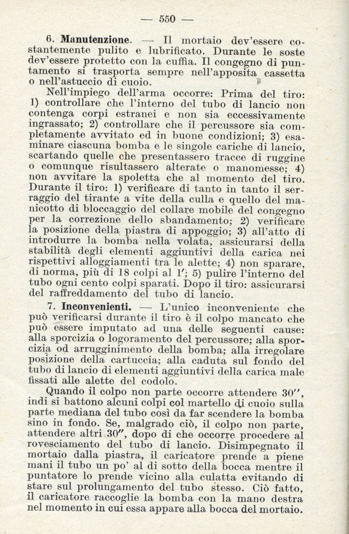 7. Inconvenienti. — L'unico inconveniente che può verificarsi durante il tiro è il colpo mancato che può essere imputato ad una delle seguenti cause: alla sporcizia o logoramento del percussore; alla sporcizia od arrugginimento della bomba; alla irregolare posizione della cartuccia; alla caduta sul fondo del tulio di lancio di elementi aggiuntivi della carica male fissati alle alette del codolo.