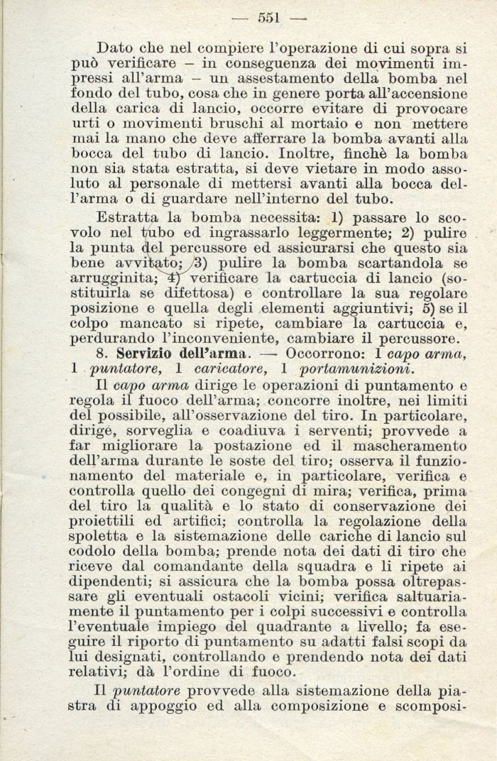 Dato olio liei compiere l'operazione di cui sopra si può verificare — in conseguenza dei movimenti impressi all'arma - un assestamento della bomba nel fondo del tubo, cosa clie in genere porta all'accensione della carica di lancio, occorre evitare di provocare urti o movimenti bruschi al mortaio e non mettere mai la mano che deve afferrare la bomba avanti alla bocca del tubo di lancio. Inoltre, finché la bomba non sia stata estratta, si deve vietare in modo assoluto al personale di mettersi avanti alla bocca dell'arma o di guardare nell'interno del tubo.