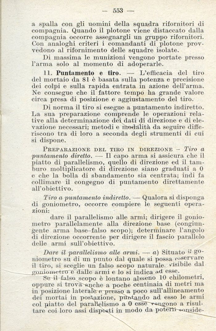 11. Puntamento e tiro. — L'efficacia del tiro del mortaio da 81 è basata sulla potenza e precisione dei colpi e sulla rapida entrata in azione dell'arma. Ne consegue che il fattore tempo ha grande valore circa presa di posizione e aggiustamento del tiro.